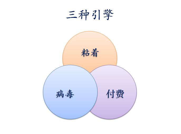黏着式增长引擎、病毒式增长引擎和付费式增长引擎,三大引擎只能三选一,不能同时使用。