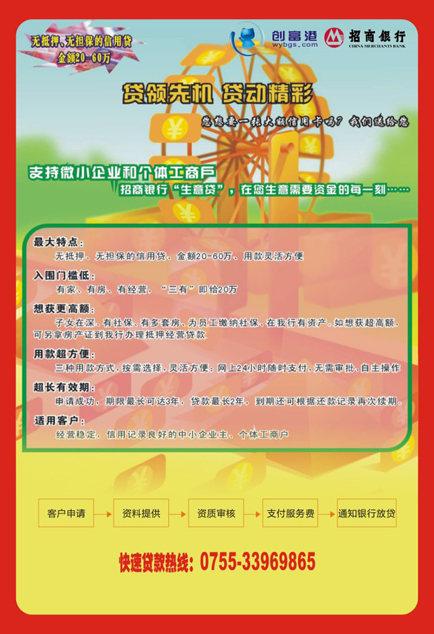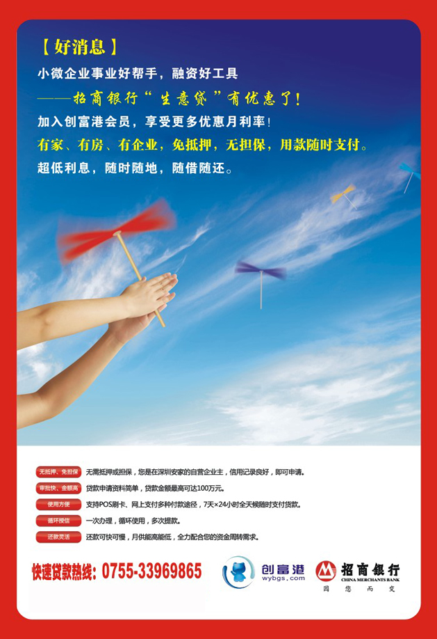 据了解,招商银行“生意贷”有着“小微企业事业好帮手,融资好工具”的市场美誉,其主要特点有:1、申请方便:有家、有房、有企业即可申请,免抵押,免担保;2、用款方便:支持POS刷卡、网上支付多种付款途径,24小时随时支付,无需审批、不跑银行,自主操作;3、免息支付:网上或刷卡支付货款,可享受“免息”延后结算期;4、超低利息: